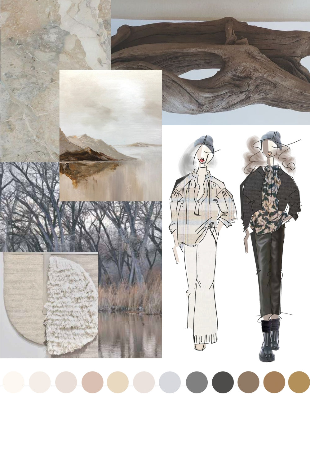 All sands, greige and greys come together in this theme, combined with a touch of metallic. We re-discovered the beauty of fabrics and yarns. Rich jacquards with shimmer and shine, coated imitation leather and cotton twills. Soft fluid blouses are made in embroidered- and wool mixed mélange voiles. Fantasy yarns and cables are styles in basic forms, like the crew neck sweater. With the trend of tailoring and masculine elements, we created a feminine look; comfy outfits with oversized pulls and jackets in souple yarns, satin singlets and fluid pleated pants.