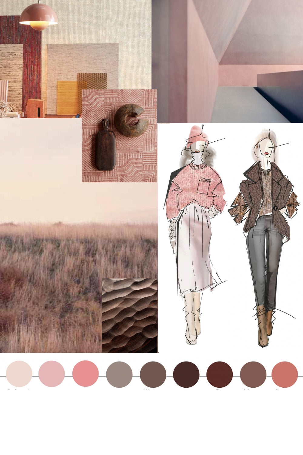 We still feel the power of warm earth tones like brown, taupe and orange. Spiced up with pink sweaters and shiny blouses. Rustic familiarity to knitwear. Functionality combined with homespun look yarns in super soft fibers. Pockets, turtle necklines, layered styling, high waisted pants and cropped pulls. The huggable teddy jacket will be the final addition to combine with all outfits.